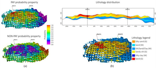 Based on described probability analysis, a probability cube has been built for each single Lithology class representing the main input for the propagation of each Lithology class in the modeled reservoir volume. However, having five lithology classes with their probabilities increased the uncertainty in the lithology model in cases of equal probability for two or more classes. Away from well control facies, probability cubes allow great facies variations. For that reason, the lithology model has been constrained by applying two-step facies modeling, i.e., by separately modeling the gas-bearing (pay) and water-bearing (non-pay) parts of the volume in the first step and then distributing lithology classes (three in pay and two in non-pay part; (Figure 16)) constrained by tentatively named pay/non-pay model.