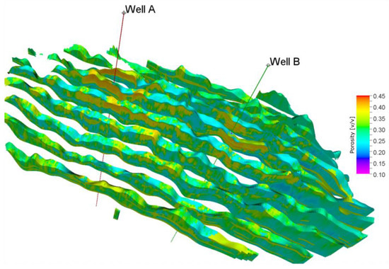 Reservoir properties modeling, as the last step, was constrained by the lithology model and driven by trends from seismic inversion and DFNN porosity volume (Figure 17). Based on available logs and advanced petrophysical analysis, as well as analog field data, it is expected that permeability and water saturation differ more for different lithology classes than porosity. The parameter that, according to the well log analysis, showed significant variations and impact on reservoir volumetrics and behavior is water saturation. It was concluded that all the parameters could be satisfactorily controlled by lithology classes, corresponding reservoir properties ranges, and trends from seismic inversion.