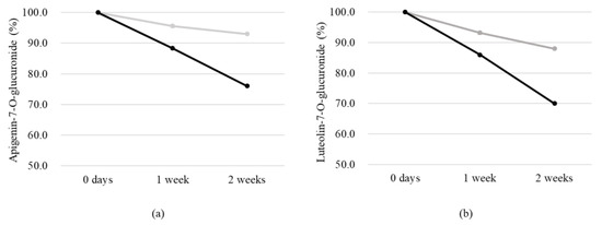 Change rate (%) of apigenin-7-O-glucuronide (a) and luteolin-7-O-glucuronide (b) contained in 0.1% AE solution from 0 to 2 weeks. The grey line indicates the A7OG content from the long-term stability test, and the black line indicates the result of the accelerated test.
