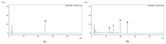 The following method was applied to quantify A7OG and L7OG as a biomarkers in the 0.1% AE cream. And the analysis method is the same as previously implemented [31]. To summarize, an HPLC system comprising a Shimadzu SPD-M20A photodiode array detector (Shimadzu, Kyoto, Japan) was used, and the column (YoungJin Biochrom INNO-P C18 5 μm, 4.6 × 150 mm) temperature was 30 °C. The mobile phase was as follows: (A) distilled water with 0.1% phosphoric acid; (B) acetonitrile with flow rate at 1 mL/min. The following gradient was used: mobile phase B was changed from 10% to 25% between 0 and 30 min, from 25% to 10% from 30 to 40 min, and, finally, to an isocratic from 40 to 50 min. The detection wavelength for A7OG and L7OG in 0.1% AE cream was 335 nm.