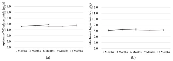 (a) Content of apigenin-7-O-glucuronide (A7OG) in 0.1% AE cream. (b) Content of luteolin-7-O-glucuronide (L7OG) in 0.1% AE cream. The grey line indicates the content from the long-term stability test, and the black line indicates the result of the accelerated test.