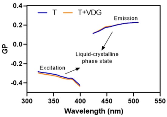 Laurdan was incorporated into T and T + VDG during their preparation by adding the probe to the lipophilic phase in a 0.33 mol% concentration. Samples were diluted with Tris-HCl buffer until forming a concentration of phospholipids of 80 μg/mL, and the fluorescence was measured with a FluoroMate FS2 (SCINCO, Seoul, Republic of Korea) at 25 °C. Generalized polarization (GP) spectra of Laurdan excitation (GPex) and emission (GPem) were calculated and graphed []. GPex spectra were calculated by: