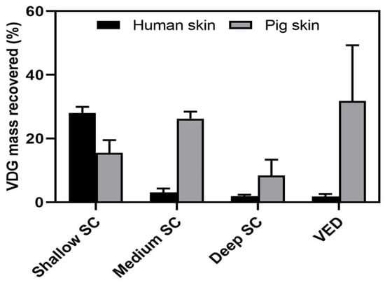VDG recovered from the different sections of human and pig skin incubated with same amounts of T + VDG for 1 h at 35 °C (n = 4). VDG was expressed as the percentage recovered from skin relative to the initial concentration of the incubated drug. Data are shown as mean ± SD.