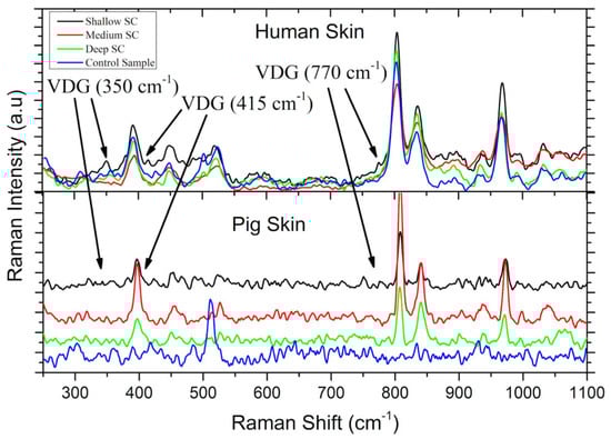 On the other hand, Raman spectroscopy is a sensitive and non-destructive technique that involves the use of optical filters to analyze the scattered radiation and obtain information about molecular structure, relying on the emission of photons, which form the unique fingerprint of functional groups []. Thus, it provides not only qualitative information, but also quantitative conformational analysis []. It is based on inelastic scattering, and measures the change in energy of the scattered radiation. Raman scattering is considered a weak, second-order process due to the interaction of the laser photons and the vibrational mode of the sample under analysis. It is a low-damage, high-sensitivity method, which make it suitable for studying lipids and drugs [], and its potential to detect molecules in the skin has been pointed out in the past decade []. Recent advancements in Raman spectroscopy have expanded its capabilities, allowing for more precise and detailed analyses of samples. The Raman spectrum of VDG was previously studied [] through their characteristic functional groups, such as pyrimidine, amide, sulfone, phenyl, and chlorine groups. Therefore, Raman spectroscopy could be of great utility in detecting compounds loaded in drug delivery systems for topical-cutaneous administration, allowing for safe monitoring of their effective arrival to deep skin layers in living individuals. This could contribute to improved treatment monitoring and optimization of dosages, by correlating the actual amount of the compound in the skin with measured effects. To pave the way towards that aim, in this work, the Raman technique is used to determine VDG directly from human and pig skin samples.