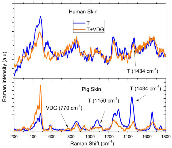 Raman spectra of VED from the remaining skin after tape stripping. The upper part shows the results from human skin samples, while the lower part corresponds to pig skin samples. In both cases, empty transfersomes (T) and VDG-loaded transfersomes (T + VDG) are shown. Arrows show the peaks found corresponding to the Raman signal of VDG, or from the lipid matrix of the transfersomes (T).