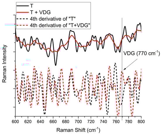Enlarged version of the Raman spectra for T and T + VDG in VED of human skin in the region ranging from 600 to 800 cm−1 and their fourth derivatives (in short dash), showing a slight shoulder at 770 cm−1 attributable to the VDG signal.