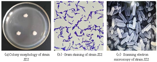 The isolated and screened strain JZ2 was inoculated into the medium for morphological observation. As shown in Figure 2, the colony generated on the culture medium was relatively large, approximately circular in shape, with neat and extended edges. The color was milky white with a slight luster. The texture was soft and sticky and appeared silky when lifted. The surface was rough, similar to frosted glass or melted wax, with a slight odor. After Gram staining, the strain was positive and produced spores (Figure 2b). The morphology of the JZ2 strain was observed using a scanning electron microscope [28]. The cells of the JZ2 strain were rod-shaped (as shown in Figure 2c).