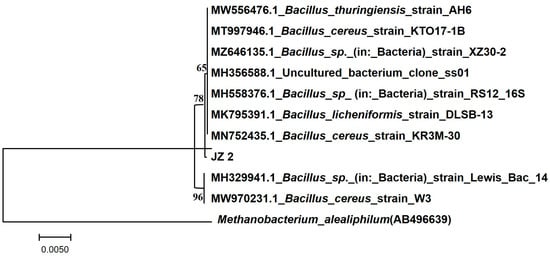 PCR sequencing of the JZ2 genomic DNA of cellulose-degrading bacteria showed that the strain sequence length was 1447 bp. We submitted the DNA sequences from strain JZ2 to NCBI for comparison. They found that the JZ2 strain had the highest homology, upwards of 99%, compared to Bacillus cereus 16S rDNA sequences. The strains associated with JZ2 were selected from NCBI comparison results. A phylogenetic tree was constructed using MEGA 7.0 (Figure 3). According to morphology, physiological and biochemical identification, 16S rDNA sequence homology analysis of the strain, and phylogenetic tree analysis, we determined that Bacillus cereus belongs to the genus Bacillus in the thick-walled Bacillus phylum. Abdelhamid et al. demonstrated that Bacillus cereus isolated from Egyptian soil is a potential producer of cellulolytic enzymes [29]. Hui et al. also reported Bacillus cereus as a bacterium that can produce degraded cellulose and polymer. They also found cellulase and xylanase genes in the B. cereus genome [30].