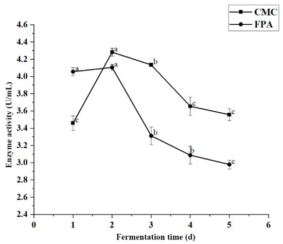 Fermentation time significantly affected enzyme activity (p < 0.05). The variation curve of cellulase activity from JZ2 at different fermentation times is shown in Figure 4. Our results showed that enzyme productivity first increased and then decreased, reaching its maximum productivity after 2 d of incubation. The maximum enzyme activity values of CMC and FPA for strain JZ2 were 4.282 U/mL and 4.105 U/mL, respectively. After 2 d, enzyme activity began to decrease. The increase in enzyme activity corresponds to the enzyme production stage of the strain. The maximum amount of cellulase was produced by continuously inducing cellulase with the substrate and the extension of fermentation time. The decrease in enzyme activity may be due to the production of other byproducts in the fermentation medium and the depletion of nutrients. These conditions cause bacterial stress, resulting in the inactivation of enzyme secretion [26,31].