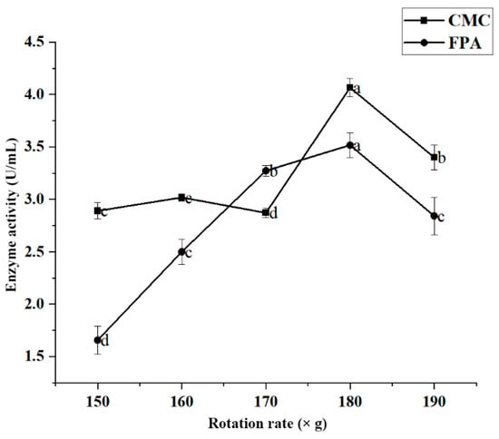 Effect of rotation rate on the enzyme production conditions of JZ2. Different letters (a–d) on same curve in the figure indicate significant differences (p < 0.05) for enzyme activity.