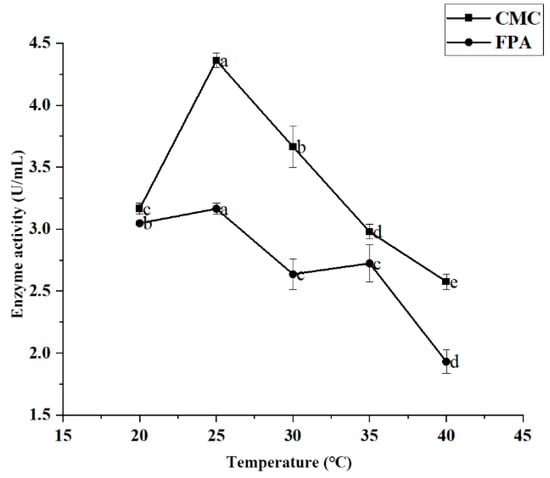 Effect of temperature on JZ2 enzyme production conditions. Different letters (a–e) on same curve in the figure indicate significant differences (p < 0.05) for enzyme activity.