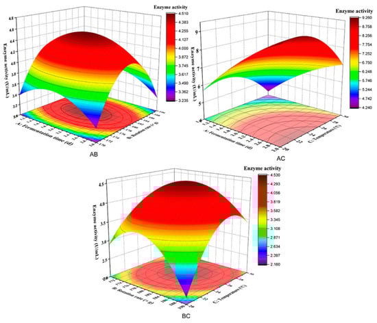Table 6 shows the analysis of variance. The p-value of the regression model was 0.0013 < 0.01, indicating that the regression equation was statistically significant. The real relationship between the three factors and enzyme activity of the response value was indicated by the misfit term of the p-value, which was 0.1056 > 0.05. R2 = 0.9447 indicated a high fit between the equation and the experimental results [34]. The regression model was proven to be effective. The coefficient of variation (CV = 7.66%) indicated good experimental repeatability and the equation’s predictive ability for the experiment. Influencing factors on the enzyme activity of strain JZ2 were temperature (C) > fermentation time (A) > rotation rate (B). Temperature and rotation rate × temperature (BC) significantly affected CMC enzyme activity at the selected factor levels. Temperature affected bacteria biosynthesis by altering the physical properties of the fermentation broth, such as the rate of dissolved oxygen and degradation and the uptake of certain substrates [35,36]. The CMC cellulase activity results under the influence of temperature showed that the highest enzyme production occurred at 25.7 °C.