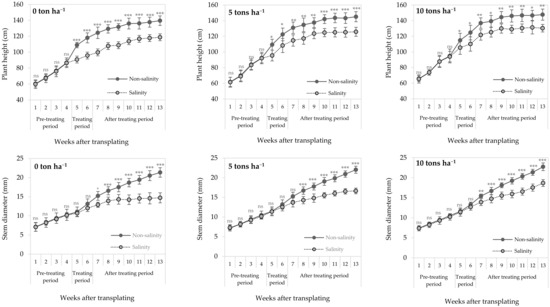 Plant height and stem diameter of sugarcane in response to salinity treatments under 0, 5, and 10 tons of biochar ha−1. Vertical bars represent mean ± SD, n = 12. Significance levels (t-test): ns: non-significant; *: p < 0.05; **: p < 0.01; ***: p < 0.001.