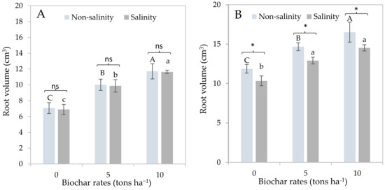 Root volume of sugarcane in response to biochar treatments of 0, 5, and 10 tons ha−1 under non-saline and saline conditions on the final treatment day (A) and 4 weeks after the final treatment day (B). Vertical bars represent ± SD, n = 9. Different letters showed significance among biochar rates under non-salinity (capital letters) and salinity (lowercase letters), respectively, by Duncan’s multiple range tests at p ≤ 0.05. For salinity treatment, significance levels (t-test) are demonstrated as follows: ns: non-significant; *: p < 0.05.