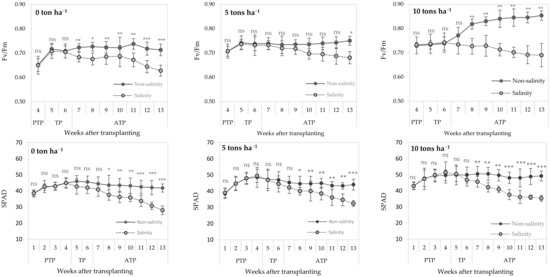 The quantum efficiency of photosystem II (Fv/Fm) and chlorophyll content (SPAD) of sugarcane in response to salinity treatments under 0, 5, and 10 tons of biochar ha−1. Vertical bars represent mean ± SD, n = 12. PTP: Pre-treating period, TP: Treating period, ATP: After treating period. Significance levels (t-test): ns: non-significant; *: p < 0.05; **: p < 0.01; ***: p < 0.001.