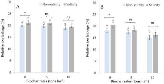 Relative ion leakage of sugarcane in response to biochar treatments of 0, 5, and 10 tons ha−1 under non-saline and saline conditions on the final treatment day (A) and 4 weeks after the final treatment day (B). Vertical bars represent ± SD, n = 9. Different letters showed significance among biochar rates under non-salinity (capital letters) and salinity (lowercase letters), respectively, by Duncan’s multiple range tests at p ≤ 0.05. For salinity treatment, significance levels (t-test) are demonstrated as follows: ns: non-significant; *: p < 0.05.