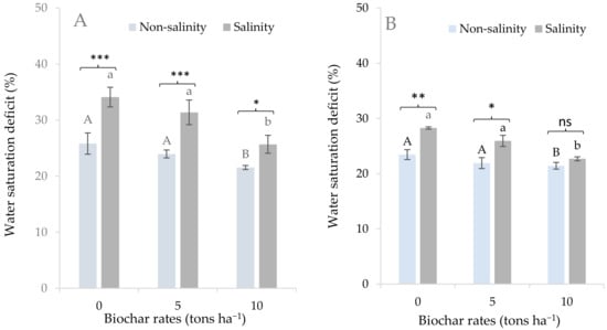 Water saturation deficit of sugarcane leaves in response to biochar treatments of 0, 5, and 10 tons ha−1 under non-saline and saline conditions on the final treatment day (A) and 4 weeks after the final treatment day (B). Vertical bars represent ± SD, n = 9. Different letters showed significance among biochar rates under non-salinity (capital letters) and salinity (lowercase letters), respectively, by Duncan’s multiple range tests at p ≤ 0.05. For salinity treatment, significance levels (t-test) are demonstrated as follows: ns: non-significant; *: p < 0.05; **: p < 0.01; ***: p < 0.001.