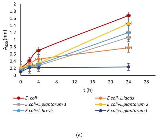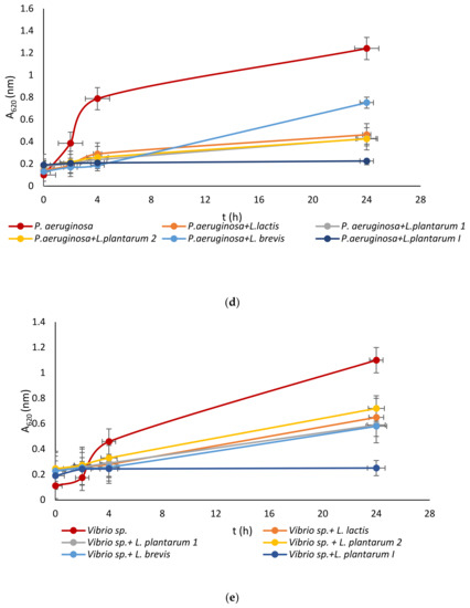 Effect of LAB isolate supernatant on growth of: (a) E. coli, (b) L. monocytogenes, (c) S. aureus, (d) P. aeruginosa, and (e) Vibrio sp.