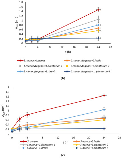 The antimicrobial effectiveness of the LAB isolates were assessed against several pathogens, including Escherichia coli ATCC 25922, Staphylococcus aureus ATCC 25923, Pseudomonas aeruginosa ATCC 27853, Listeria monocytogenes ATCC 23074, and Vibrio sp., using the turbidimetric techniques outlined by Frece et al. [35]. Test microorganisms were grown in nutrient broth (Biolife). The LAB supernatant (240 μL) was added to microtiter plate wells with 10 μL of the test microorganism, and the antibacterial activity of the LAB culture was monitored over 24 h at 37 °C using a microtiter plate reader (Sunrise, Tecan, Männedorf, Switzerland) and the absorbance was measured spectrophotometrically at 620 nm. Blanks were prepared without the addition of microorganisms. The degree of inhibition was calculated using the expression: degree of inhibition (%) = (1 − A1/A0)⋅100 [35]. The pathogens were part of the collection of microorganisms from the Laboratory for General Microbiology and Food Microbiology, Department of Biochemical Engineering, Faculty of Food Technology and Biotechnology, University of Zagreb, Croatia. To eliminate the effects of lactic acid, the cell-free supernatant of the LAB was adjusted to pH = 6.5 with sterile 1 M NaOH (Gram-Mol).