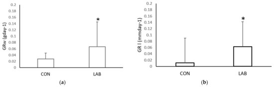 Growth rate: (a) weight (GRw) and (b) length (GRl), of the control (CON) A. opercularis and those exposed to LAB isolates (LAB), over four weeks. * p < 0.001.