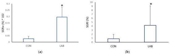 Specific growth rate: (a) weight (GRw) and (b) length (GRl), of the control (CON) A. opercularis and those exposed to LAB isolates (LAB), over four weeks. * p < 0.001.