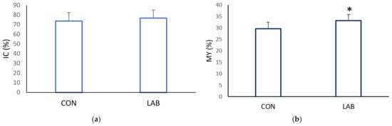 Commercial quality: (a) condition index (CI) and (b) meat yield (MY), of the control (CON) A. opercularis and those exposed to LAB isolates (LAB), over four weeks. * p < 0.001.