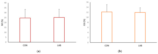 Somatic indices: (a) muscle index (MI) and (b) gonadosomatic index (GSI), of the control (CON) A. opercularis and those exposed to LAB isolates (LAB), over four weeks.