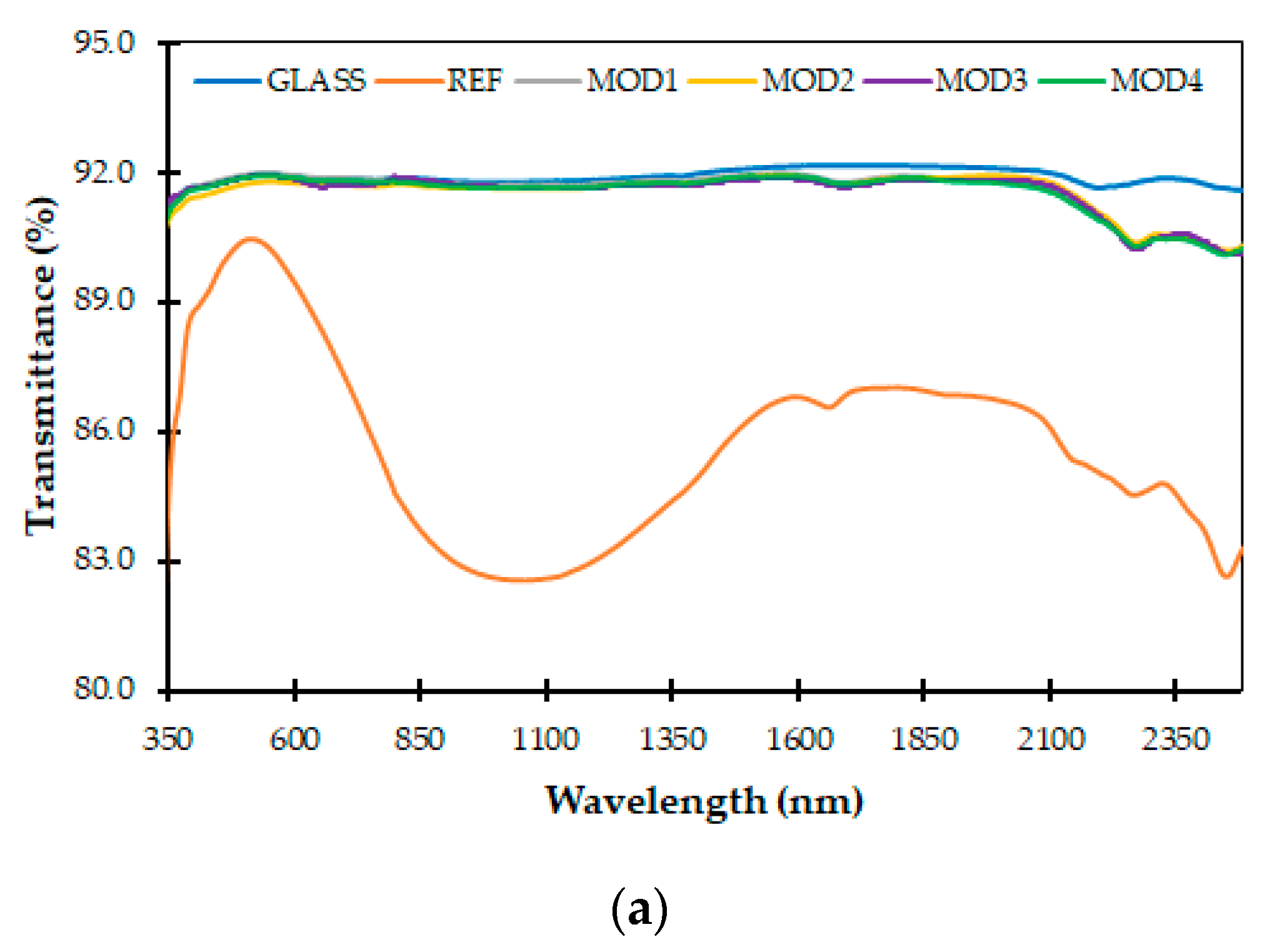 - Priyadarshini, B.G.; Sharma, A.K. Design of multi-layer anti-reflection coating for terrestrial solar panel glass. Bull. Mater. Sci. 2016, 39, 683–689. [Google Scholar] [CrossRef]