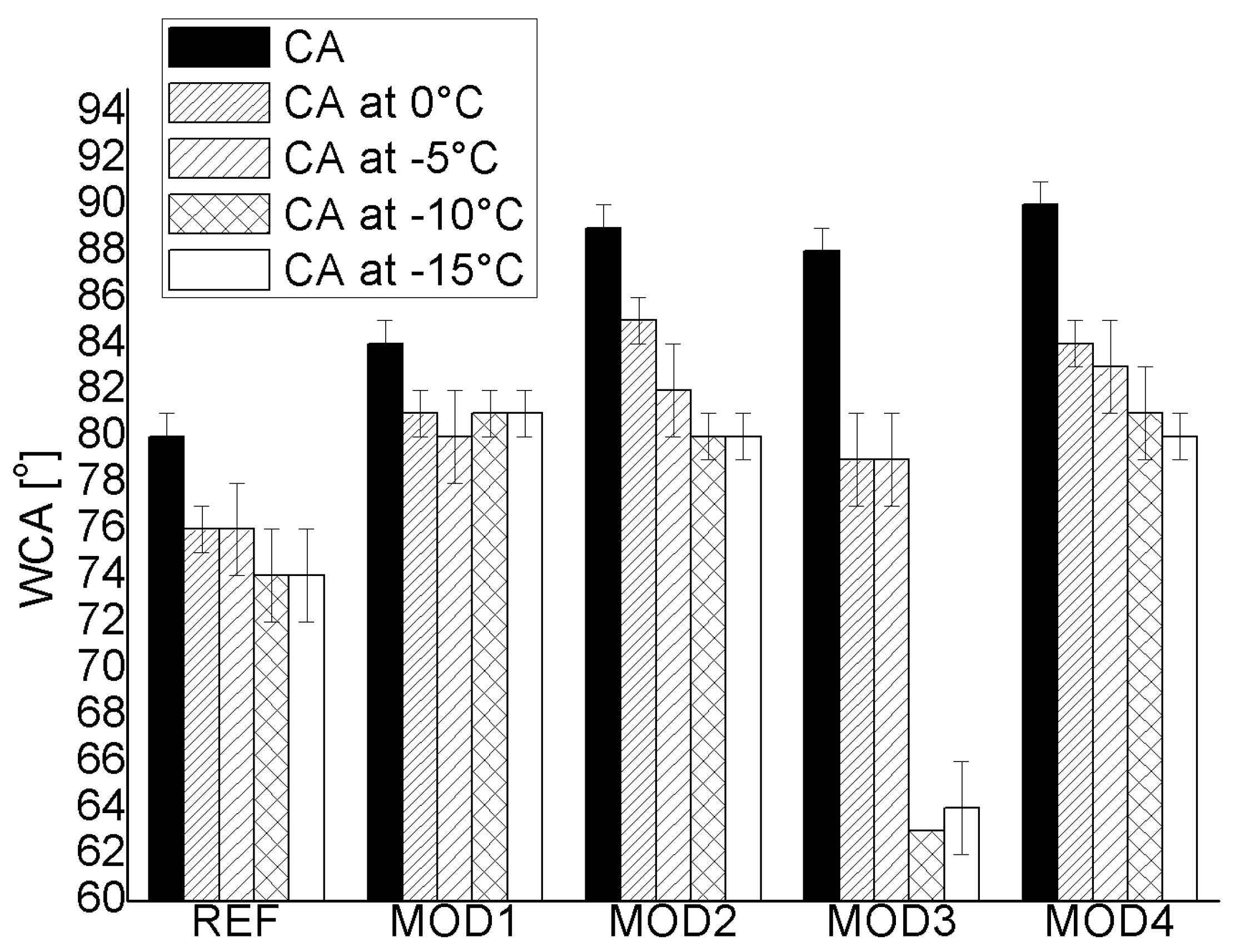 - The WCA values at reduced temperatures decreased for all applied modifications compared to the WCA values determined at room temperature. In addition, it was observed that the lower the ambient temperature, the lower the WCA value.