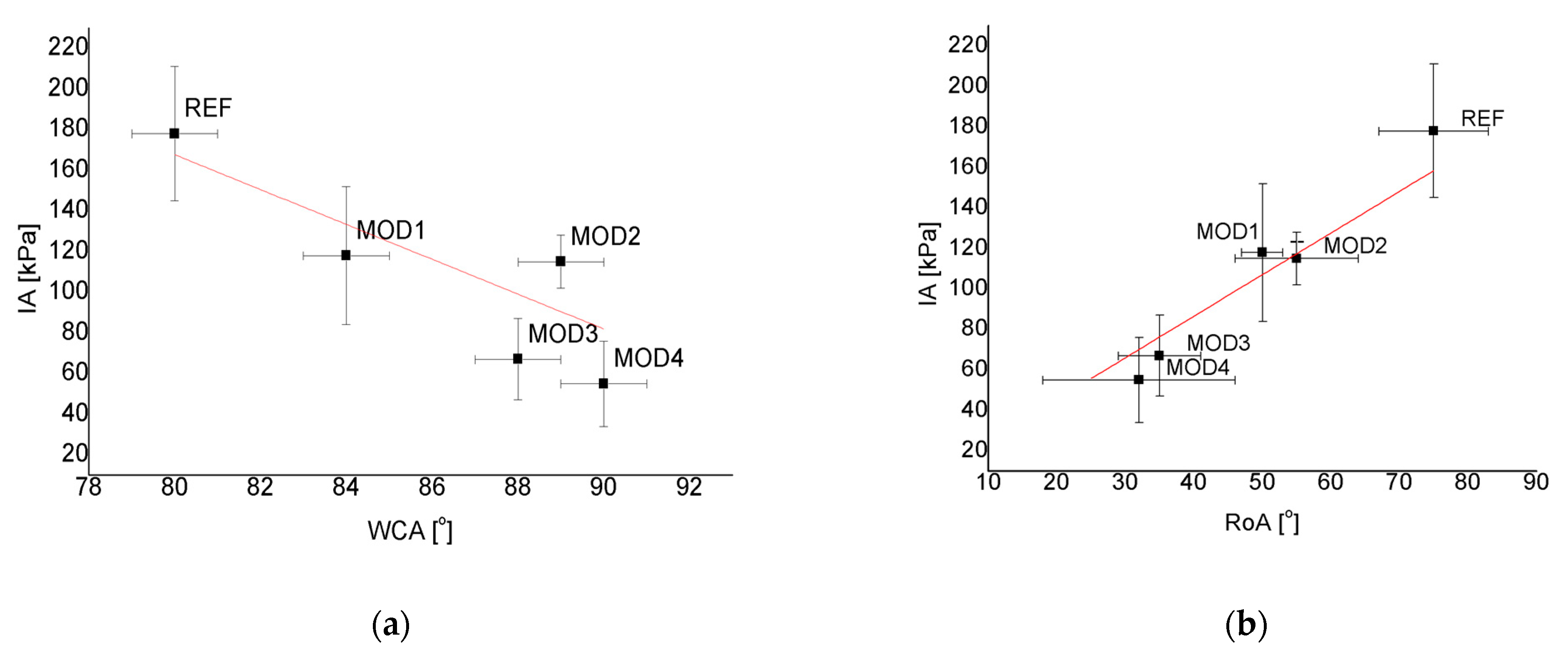 - Two relationships were observed for the modifications used. As the WCA values increased and as the RoA values decreased, the IA values were reduced.