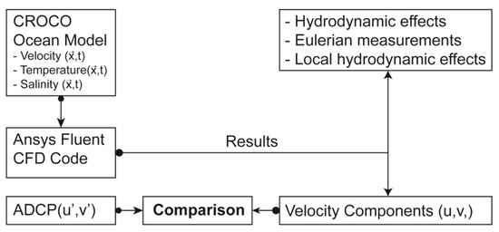 Figure 1 shows the simulation methodology flowchart followed for the hydrodynamic simulation of the Caucahue Channel. The methodology is based on the interaction of two simulation frameworks: the first one is based on a Regional Oceanic model (CROCO) wherein the resolution is of the order of hundreds of meters, oriented to predict the large-scale circulation to force a second local modeling approach, based on a Large Eddy Simulation (LES) model implemented in a Computational Fluid Dynamics (CFD) framework, with a resolution of the order of meters, focused on predicting the small-scale circulation characteristics of the channel and the local hydrodynamic behavior of aquaculture farms.
