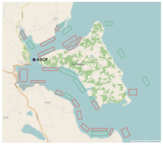 Caucahue Channel. Position of the ADCP is indicated by a blue dot. Salmon and mussel concessions are shown in green and red boxes.