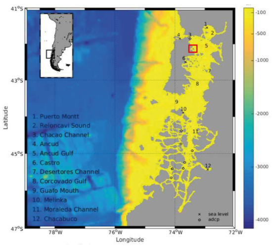The regional ocean simulations were run by employing the Coastal and Regional Ocean Community model. The domain extends meridionally between 41° S to 47° S and zonally from 79° W to 72° W, as shown in Figure 3. This model has a horizontal resolution of 1/72° and considers 32 vertical levels. The bathymetry was built upon a mixture of data from GEBCO08 [62] and data provided by the Chilean Hydrographic and Oceanographic Service (SHOA). The minimum depth considered reached 10 m, and the shoreline was enhanced to include the main fjords and channels of the CIS based on topographic information from SHOA. For initial conditions, the World Ocean Atlas 2009 [63,64] was used. Tide forcing was considered using surface elevation and barotropic velocity components from the TOPEX/Poseidon global tide inverse solution (TPXO8 [65]). The free surface was considered by forcing heat and wind fluxes from NCEP2 [66]. Ten tidal constituents were employed simultaneously: four semi-diurnal components (M2, S2, N2, K2); four diurnal components (K1, O1, P1, Q1); and the long lunar period tides Mf and monthly Mm. The simulation period chosen was June–July 2014 due to the availability of ADCP data.