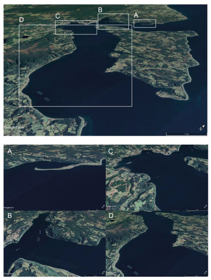 The southern branch of the Caucahue Channel contains the most fish and mussel farming concessions; at the time, this region developed the most complex circulation, and in the history of sanitary conflicts, this region was affected by the large 2007–2009 ISAV outbreak [67].