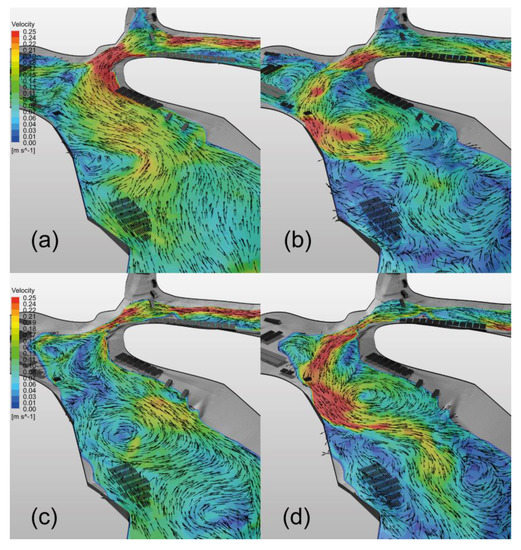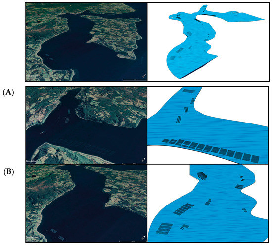 The present simulations results, together with previously reported evidence that confirms the link between the velocity magnitude inside fish farms and the growth rate and FCR [70,71,72], allow for the projection of the foundations for the consideration of farms with a differentiated number of fish according to the distribution of the velocity magnitude within each cage during the productive cycle, i.e., the aquaculture industry can enhance its productivity by the proper use of hydrodynamics predictions.