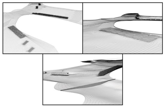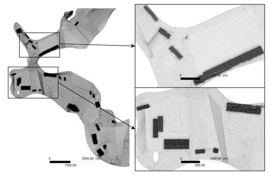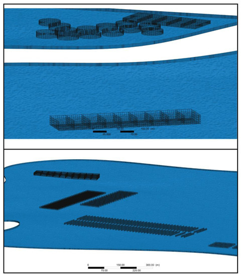 Control volume was discretized using a computational grid of 2.1 million cells. Figure 6, Figure 7, Figure 8 and Figure 9 show different views of the grid. The horizontal resolution was considered between 1 m and 30 m, where the highest resolution is found within the fish and mussel farms. Depth was discretized with 16 non-uniformly spaced levels.