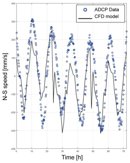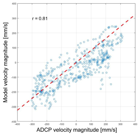 Using the simulation methodology described in the previous sections, we simulated three days of the small-scale circulation considering successive floods and ebb tide corresponding to semi-diurnal variability in the period between 19 and 21 June 2014. In order to investigate the hydrodynamic effects associated with the presence of massively installed aquaculture infrastructure in the Caucahue Channel, two simulations were run: one considering the hydrodynamic effect of fish and mussel farms and the other without considering its effect. Model predictions from the simulated period are in good agreement with data from ADCP measurements. Figure 10 shows the comparison of the velocity magnitude predicted by the local CFD model and the ADCP data measured in situ in the constriction of the Caucahue Channel. Figure 11 shows this comparison in the form of a scatter plot. The dotted red line shows the level of correlation associated with R∼0.81.