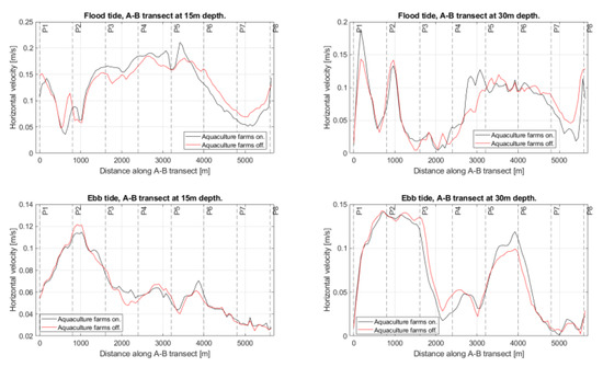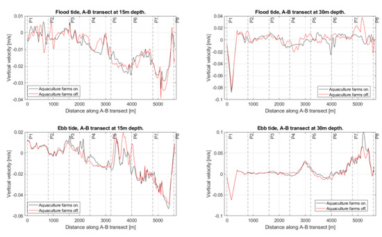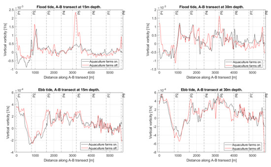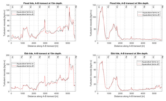 Figure 14 shows transect AB axially crossing the southern branch of the Caucahue Channel. Figure 15, Figure 16, Figure 17 and Figure 18 show the comparison of simulations considering the fish and mussel farms installed and simulation without considering its hydrodynamic effect for the horizontal velocity magnitude, vertical velocity, turbulent viscosity, and z-vorticity and for the flood and ebb tide at 15 m and 30 m depth, which follow the ABA transect. Results show the hydrodynamic effect of the aquaculture infrastructure over the channel’s hydrodynamics is not local but spreads far from them, showing significant differences between the distribution of hydrodynamic variables obtained in the simulations considering the installation of farming centers compared with the simulations that do not consider its effect. In the case of turbulent viscosity, associated with the diffusion of dissolved elements, this difference is more significant in shallower waters. Regarding the horizontal velocity magnitude, the installation of farming centers implies differences that can generate a decrease of 81% for flood tide and 30 m depth and an increase of 300% for ebb tide and 30 m depth. In the case of vertical velocity, the presence of centers can decrease its magnitude up to 13% at 30 m depth and flood tide or increase by 170% at 30 m depth and ebb tide. On the other hand, for vertical vorticity, the presence of farming centers can decrease its magnitude by 20% at a 15 m depth and a flood tide, while at an ebb tide and 30 m depth, it can increase by 700%.
