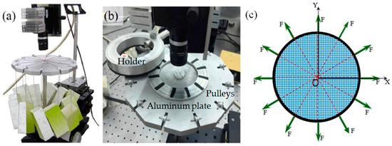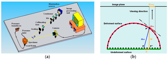 Cosola et al. [34] combined intrinsic moiré (IM) and projection moiré (PM) to simultaneously measure 3D displacements u,v,w(x,y,z) of inflated membranes. Their IMPM experimental setup is shown in Figure 1a.