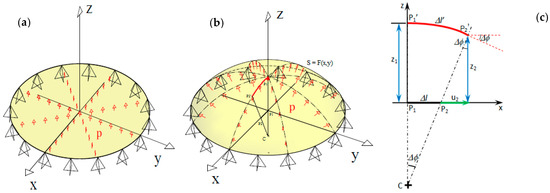In order to prove the above statements, the schematic of Figure 2 can be considered. A circular membrane is inflated by pressure, thus passing from the undeformed configuration (Figure 2a) to the deformed configuration (Figure 2b). The simplest case regards an axi-symmetrically deformed specimen (i.e., there are only two displacement components u = v and w, respectively, in the X/Y- and Z-directions; see Figure 2b) and the reference configuration is a flat surface (see Figure 2a). Figure 2c presents a X–Z diametrical section of the deformed membrane. The undeformed state corresponds to the straight segment while the deformed configuration corresponds to the arc . Furthermore, if point P1 lies on the symmetry axis of the investigated object, it does not displace in the X/Ydirection.