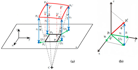 Figure 3b refers to a generic vertex Pi (i = 1, 2, 3, 4) of the surface element under analysis, which displaces to the deformed position Pi′ (i = 1, 2, 3, 4): the 3D displacement vector (Pi′ − Pi) comprises the total in-plane displacement UTi and the distance zi of Pi′ from the reference plane π. The following relationships hold true for each vertex of the selected portion of the membrane: