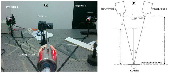 Figure 4a shows the one-shot projection moiré optical setup used here. The moiré setup is schematically represented in Figure 4b. The gratings were projected by standard LTPR3W/R led projectors (λ = 630 nm), symmetrically placed with respect to the direction of observation; each projector projected a glass slide containing a 254 μm pitch cross-grating (i.e., po = 100 lines/in), and the projection cone had an aperture of 18°. The two symmetrical projectors realize the condition of projection from infinity. The distance of the CCD camera from the analyzed object and the camera’s objective are selected so as also to have viewing from infinity. The distance between the baseline limited by the exit pupils of the two projectors and the reference plane was d = 675 mm, while baseline length was t = 930 mm; distance between camera and reference plane was r = 475 mm; illumination angle made by each projection direction and viewing direction was θ = 34.6° (see nomenclature in Figure 4b). The selected angle of illumination allowed fringe quality to be optimized.
