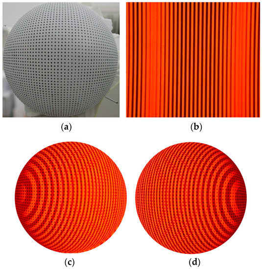 The moiré data were processed as described in [34], and the corresponding displacement fields were taken as the target for evaluating the performance of the one-shot projection moiré setup utilized in this study. The images in Figure 5 recorded by the two-projectors IMPM setup for the inflated membrane refer to the following: the printed dot grating (Figure 5a); the projected gratings by left and right projectors (Figure 5c,d); and the central region of the projected line patterns (Figure 5b). In Figure 5b, the high-frequency lines correspond to projected vertical lines by the two projectors, while the low-frequency fringes are produced by the interfering wave fronts originating from the two projectors.