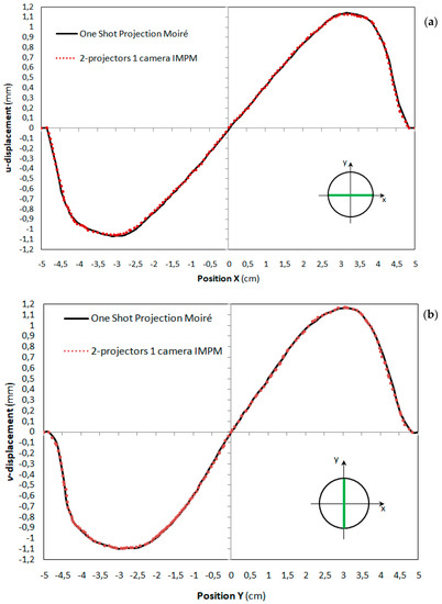 The topography of an object’s surface is fully defined if the coordinates of points sampling the surface are known. The displacement vector of a given point P(x,y,z) of the object’s surface that moves to the position P′(x′,y′,z′) in the deformed configuration is defined by the differences of coordinates {(x′−x);(y′−y);(z′−z)} between P′ and P. Projection moiré can give information on the Z-coordinates of surface points as well as on slopes and curvatures of the surface, provided that cross-gratings are projected onto the specimen [31,35,36]. The modulation of vertical lines projected onto the specimen gives information on the X–Z surface profiles defined by coordinates x and z, while the modulation of projected horizontal lines provides information on the Y–Z surface profiles defined by coordinates y and z. The X–Z and Y–Z profiles obviously share the same z at their intersections. By combining such information, it is possible to determine the position of each surface point with respect to the reference system selected in the measurements.
