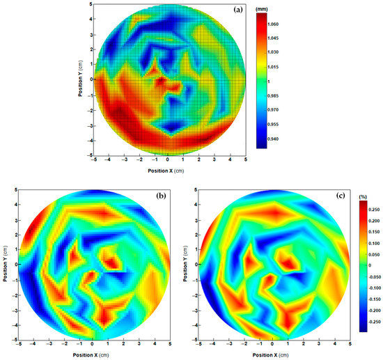 where Rc is the local curvature radius of the deformed membrane; the angle Δϕ is limited by the arc , portraying the local surface’s deformation. If the deformed arc belongs to a circumference, the curvature radius is constant. Otherwise, the average of the curvature radii evaluated at points P1′ and P2′ has to be determined. For example, for the X–Z deformed profile of Figure 2c, the values of curvature radii at P1′ and P2′ are obtained by evaluating the 1/(∂2w/∂x2) function at xP1′ and xP2′. The same argument can be made for the Y–Z deformed profile, considering the 1/(∂2w/∂y2) function and coordinates yP1′ and yP2′. The w-displacements are determined with projection moiré.