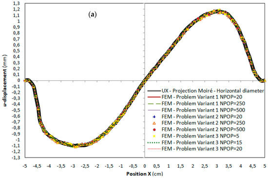 The displacement field measured with projection moiré was compared to its counterpart computed by an FE model simulating experiments. The error functional Ω thus defined was minimized in order to identify material/structural parameters. The optimization problem defined by Equation (1) was hence solved with the hybrid HS–JAYA metaheuristic algorithm combining the two well-established metaheuristic methods of harmony search optimization (HS) and JAYA. The new algorithm was formulated so as to minimize the computational cost entailed by the solution of the inverse problem (1). For that purpose, exploration and exploitation phases were properly mixed in the formulation of HS–JAYA and continuously alternated in the metaheuristic search process.