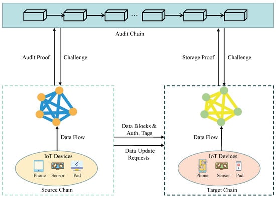 The emergence of blockchain technology provides a promising alternative for addressing these challenges [15,16]. Blockchain possesses several essential characteristics, including transparency, tampering, and decentralization, which enable distributed data storage and consistency verification and ensure the security and privacy of data. Additionally, cross-chain technologies can facilitate data exchange and interaction among different IoT devices [17,18,19], thereby mitigating the problem of data silos and promoting further development in the IoT domain. However, ensuring secure and reliable data storage as well as achieving traceability and consistency verification of data interactions remain critical research challenges. Currently, the focus of research on addressing data consistency auditing primarily centres on traditional cloud storage. Provable data possession (PDP) [20] is a key technique for verifying data consistency, which utilizes a third-party auditor to conduct audits on the data. However, the reliability of third-party auditors cannot be guaranteed, and this approach undermines the decentralized feature of blockchain technology.