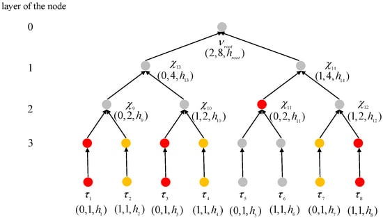 - constructs the batch verification Merkle hash tree (BV-MHT) based on the processed data to facilitate efficient and secure data auditing. In BV-MHT, each node stores a tuple (), which represents the position information of the node in BV-MHT. Specifically, if the node is the i-th leaf node , is set to 1 and . If the node is a non-leaf node , stores the number of the leaf nodes that can reach from the left to right and , where and denote the left and right child nodes of [37]. If the node is the left child node of its parent node, is set to 0; the node is the right child node of its parent node, is set to 1; the node is the root of the BV-MHT, is set to 2. The process of constructing BV-MHT is shown in Figure 2 and the nodes are verified simultaneously.