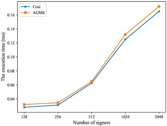 The execution time of Cosi and AGMS in different numbers of signers.