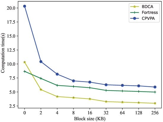 We conduct experiments to evaluate the computation overhead of BDCA with a similar scenario as in previous studies using Fortress [48] and CPVPA [38]. As shown in Figure 6, our experimental results indicate that the computation overhead of the BDCA in preprocessing data is lower compared to the Fortress and CPVPA schemes. This is attributed to the fact that the Fortress scheme requires the utilization of zero-knowledge proofs (ZKPs) in preprocessing data while the CPVPA scheme involves multiple costly exponentiation and multiplication operations, resulting in a significantly larger computation overhead. Figure 7 reveals that when the number of challenged blocks is fixed at 300 blocks, irrespective of block size, the computation cost of BDCA in auditing data is marginally superior to that of Fortress. This is due to the fact that the Fortress scheme requires doubling the computations for combined blocks with two different authentication tags, whereas BDCA exhibits a more efficient performance in this regard. Moreover, the computational efficiency of BDCA is significantly higher than that of the CPVPA scheme, which involves multiple computations for combined blocks with different authentication tags. In general, BDCA is efficient in computation.